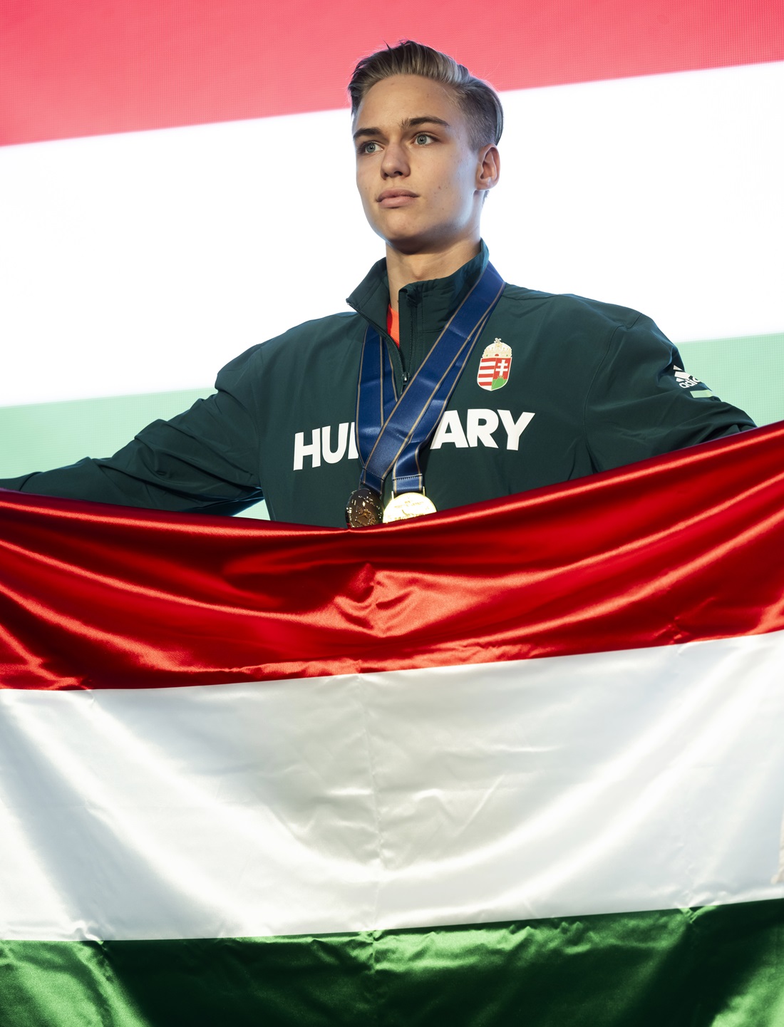 Máté holds his national flag. Image credit: Áron Süveg